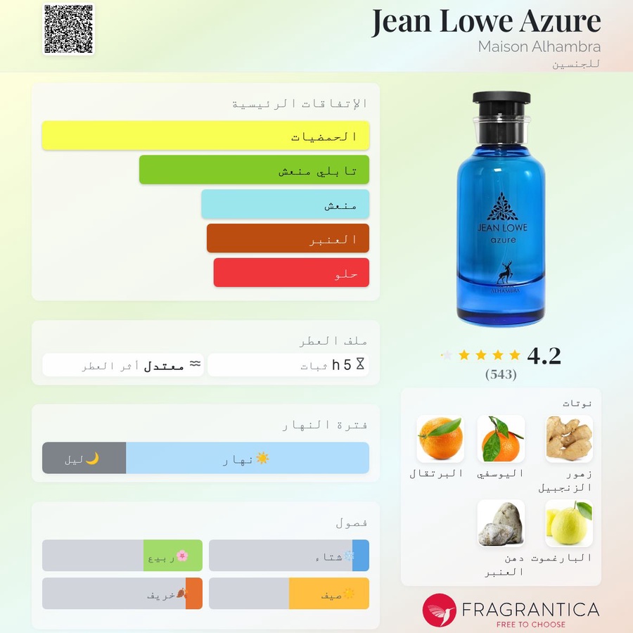 عطر شرقي – حمضي – عطري، أنيق ومنعش، يجمع بين الحيوية والانتعاش تحت شمس الصيف. يفتتح بمزيج حمضي مشرق من البرغموت 🍋 والماندرين 🍊، يليه قلب مبهج من البرتقال الحلو، ثم يستقر على قاعدة دافئة من الزنجبيل 🌿 والآمبرغريس 🌊 تمنح العطر عمقًا وتوازنًا.