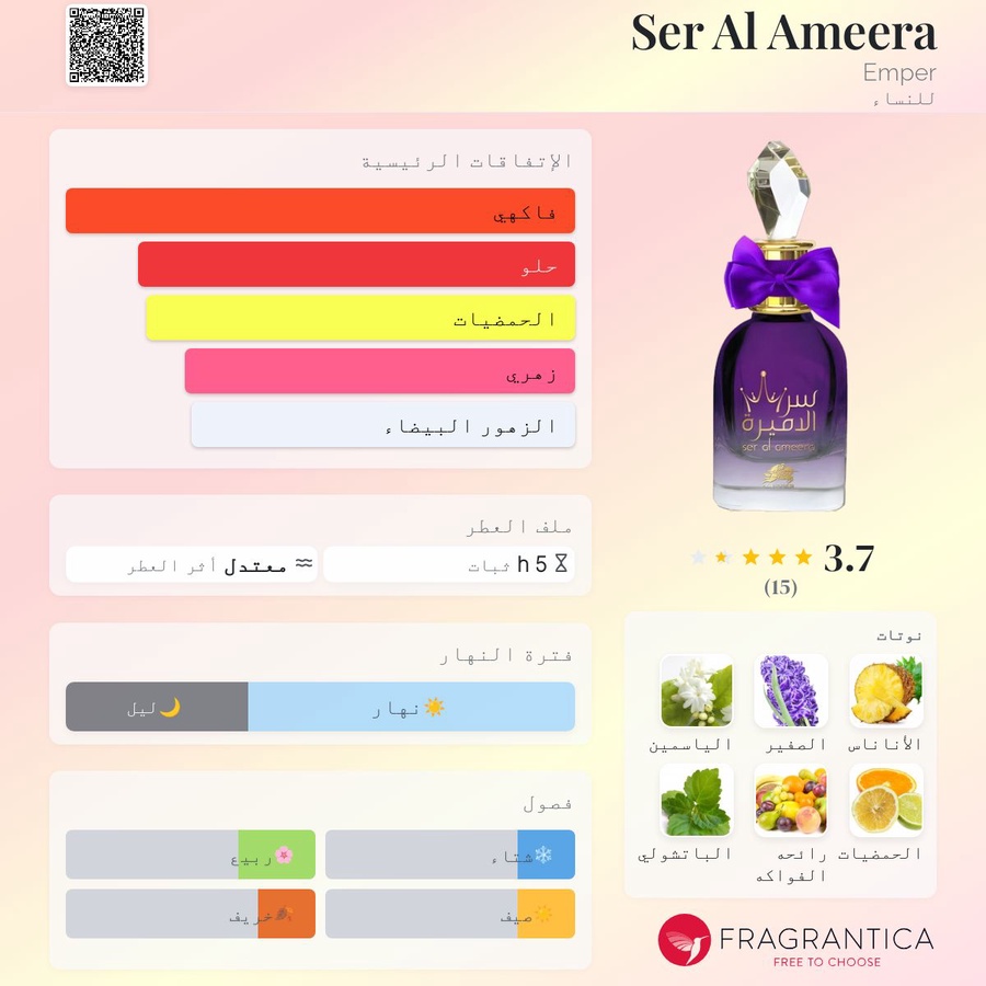عطر زهري – فاكهي فاخر من إنتاج Al Fares – Emper، يتميز بثبات عالي وفوحان جذاب يعكس روح الأميرة الحرة التي تشع أناقة وسحر في كل مكان